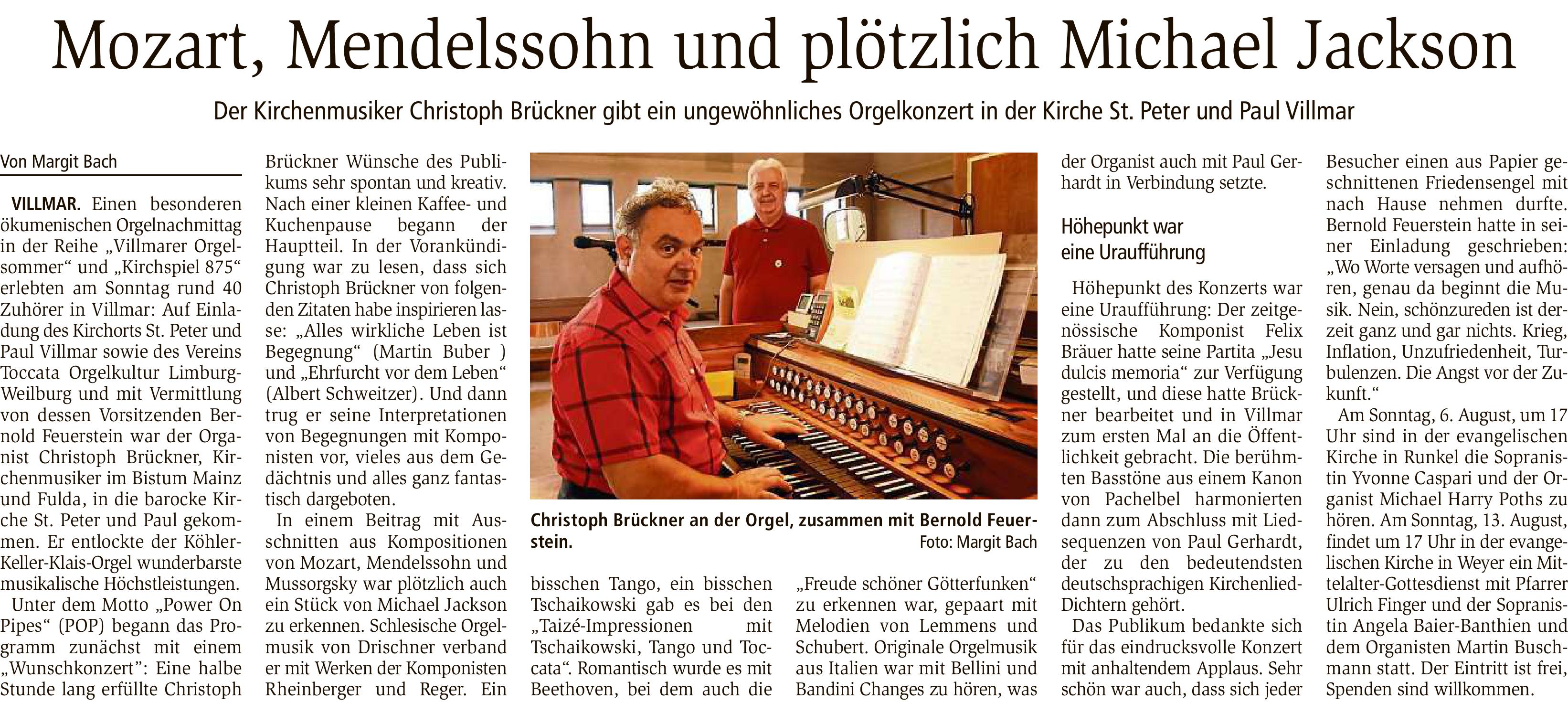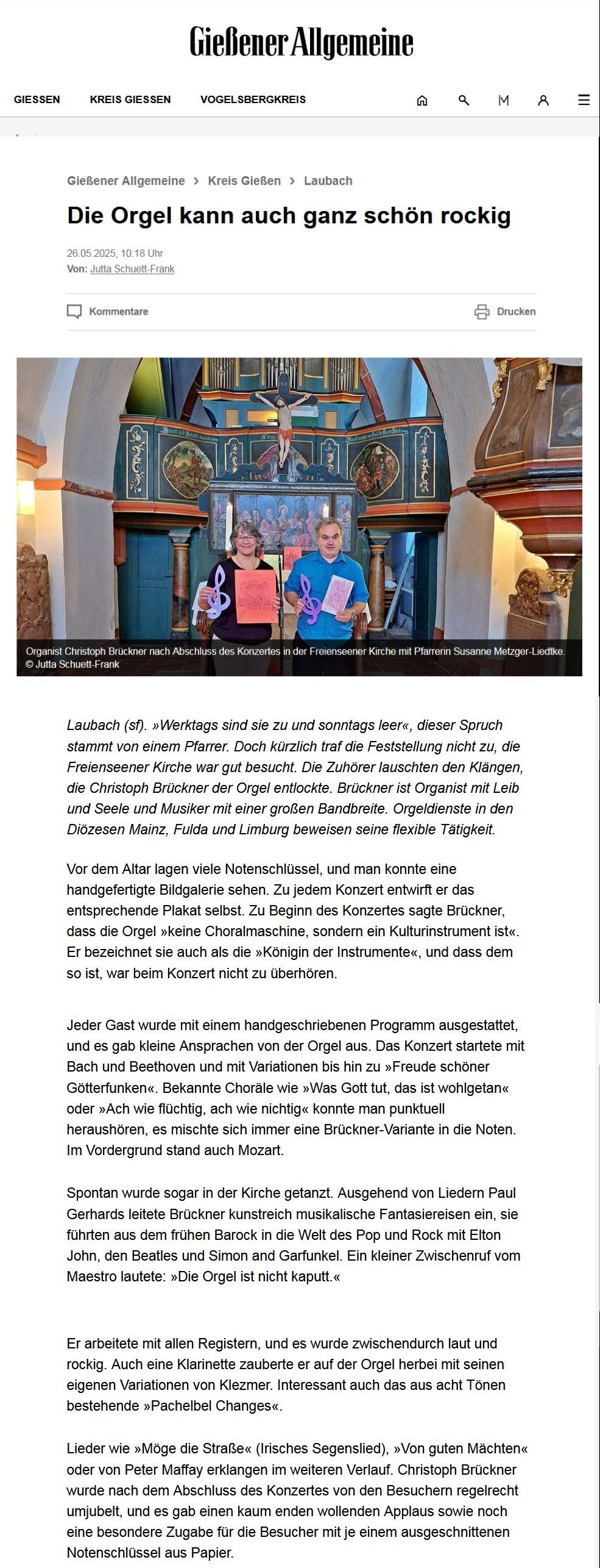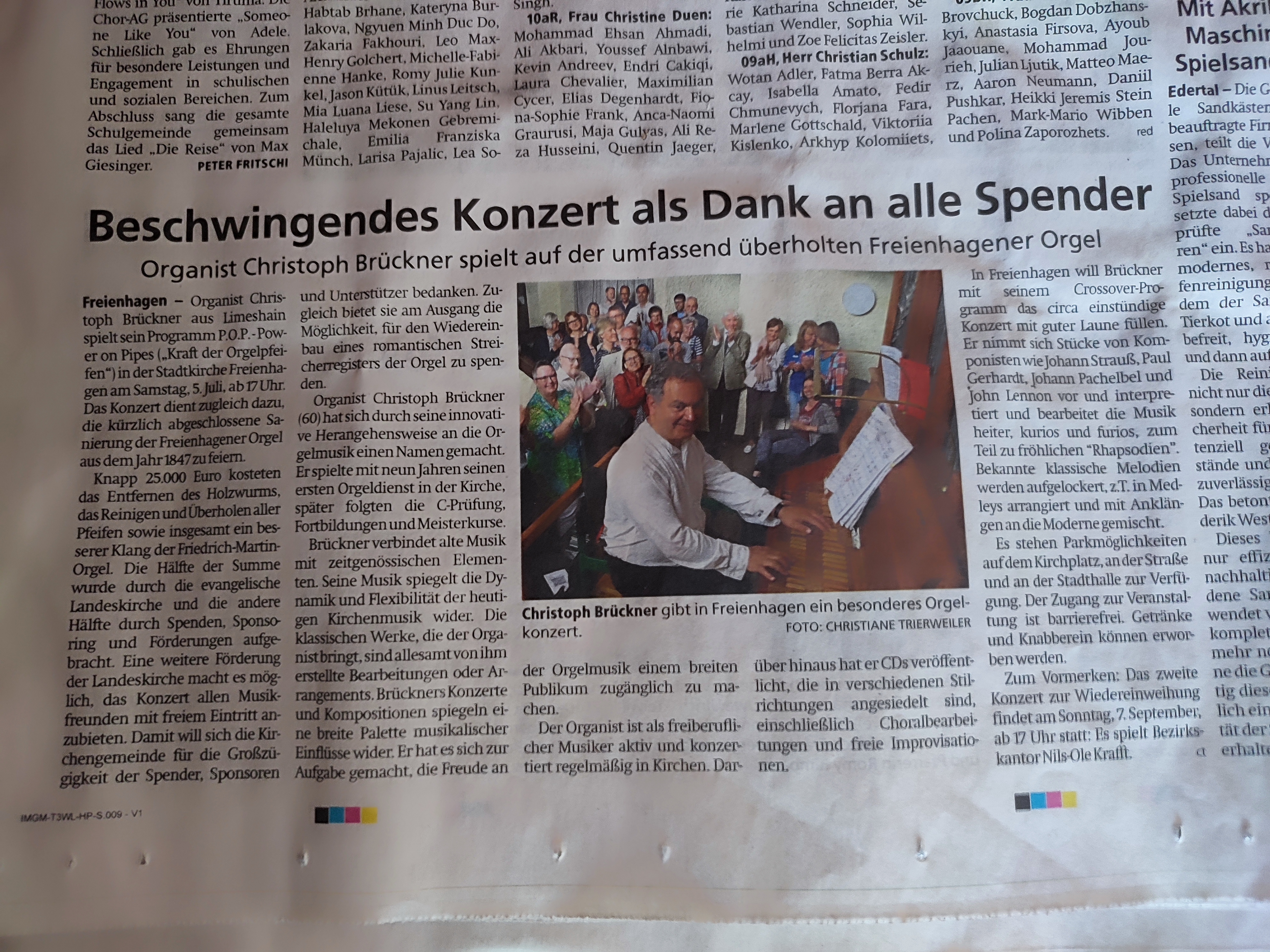 Voranzeige, Orgelkonzert in Freienhagen Waldeck / 05.07.2025: Orgelkonzert in Freienseen Laubach / 26.04.2025, Zeitungsartikel vom Giessener Allgemeine vom 26.05.2025: Weilburger Tagesblatt 26.07.2023: Usinger Anzeiger, Konzert in Usingen-Eschbach, Artikel vom 13.07.2023: Konzert in Berge / Quakenbrück 12. Dez. 2019. Artikel aus NOZ v. 13.Dez.2019